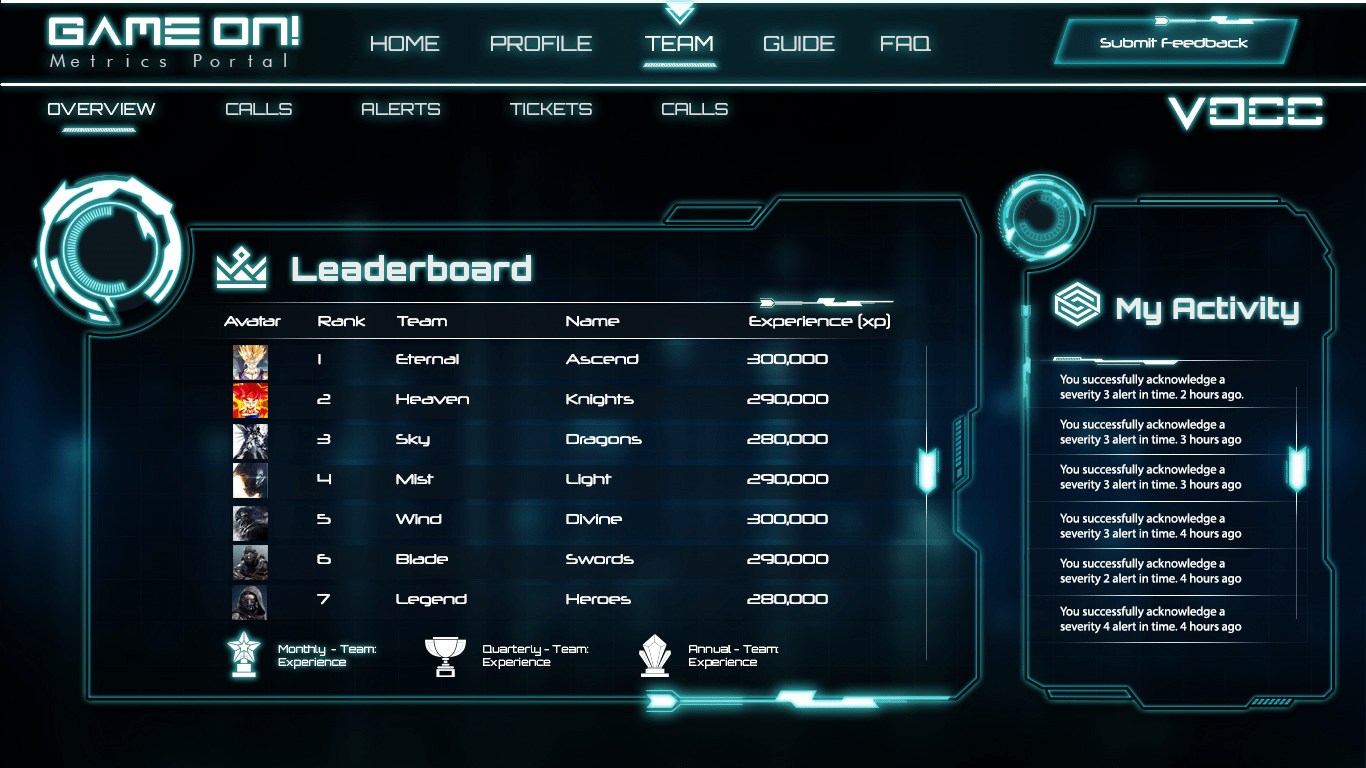 GameOn provides a gamification-based engagement solution designed to guide and drive the use of metrics. Key metrics for GameOn includes performance, calls, tickets, alerts and customer support where gamification is used to drive specific actions or processes.